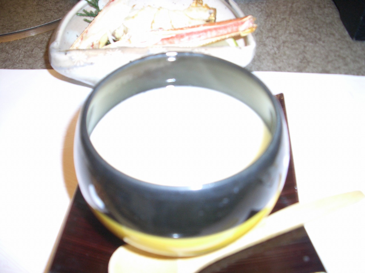 とある かに料理専門店の特選かに懐石料理の写真です。これはかに茶碗蒸しです。中にシイタケ、しめじ、かにの小さな足が入っています。ふつうの茶碗蒸しと違い、かにのだしがよく利いていて非常にいい味がしました。