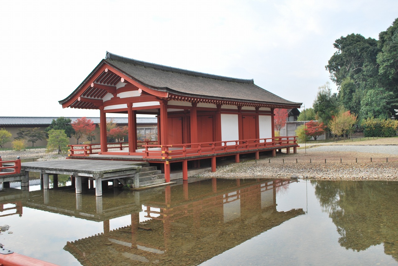 特別名勝 平城宮 東院庭園の写真です。平城宮の東に張り出した部分が「東院」に当たる。昭和42年(1967年)にその南東側に大きな庭園の遺跡が発見され、平成7年(1995年)~平成10年(1998年)にかけて復元されました。現在の迎賓館にあたる建物の写真です。これは「東院玉殿」と呼ばれる建物です。現在では特に貴重な古代庭園として特別名勝に指定されている。入館は無料で開館は9:00~16:30までです。