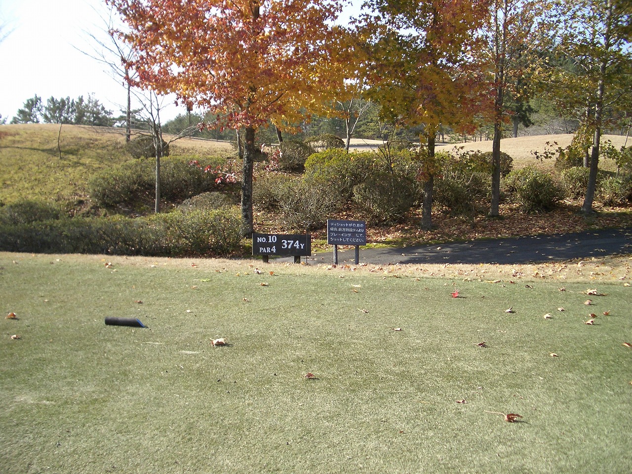 滋賀カントリークラブ10番の写真です。このホールは374ヤードPAR4のミドルホールです。打ちおろしでティーショットは距離が出やすいです。やや左にドックレッグしていて右めを狙いところだが思い切って左を狙ってみたい。フェアーウェイが右に傾いているので戻ってきます。