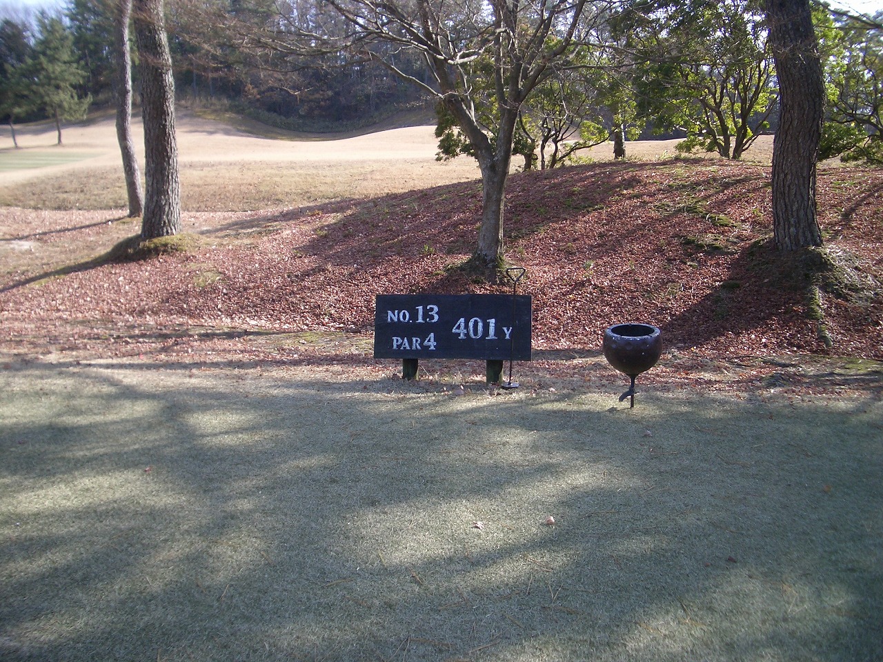 滋賀カントリークラブ13番の写真です。このホールは401ヤードPAR4の長めのミドルホールです。目標はフェアーウェイセンターです。うまくいけばクロスバンカーを越える。セカンドはかなり距離が残るので右サイド狙いでいく。左バンカーはあごが高いので要注意だ。メイングリーンとサブグリーンの間をねらうとパーが狙いやすい。
