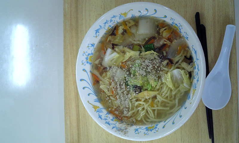 社員食堂で食べた昼食の写真です。これは五目ラーメンです。タケノコ、白菜、白ネギ、細かい豚肉、きくらげ、卵をとじたもの等たくさんの野菜が入っていて結構おいしいです。価格は262円とお得ですね。スープも塩風でいけました。また食べようかな