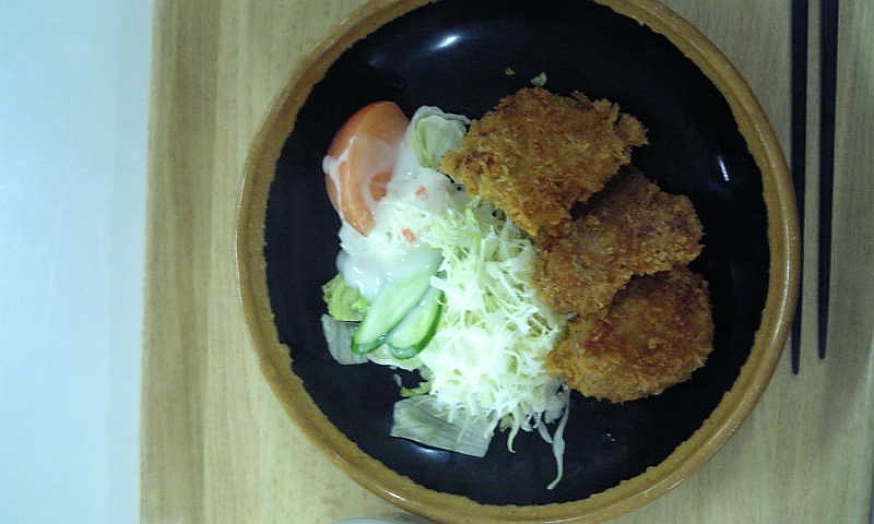 社員食堂での昼食の写真です。今日はヘレカツです。小ぶりのヘレカツが3枚、きゅうり薄いのが2枚、ポテトサラダ少々、トマト1切れ、キャベツ千切りが少し多めです。ヘレカツにはソースをかけずにポン酢であっさり味で食べました。価格は367円です。ヘレカツは少し温かく柔らかくておいしかったです。