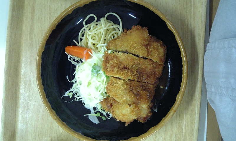 社員食堂での昼食の写真を撮りました。チキンカツです。大きなチキンカツが4つに切ってあって、デミグラスソースらしきソースがかかっていました。キャベツ、人参の煮たもの、スパゲティが少々入っていました。価格は税込みで367円です。安くて結構ボリュームがありましたね。また写真を撮って載せたいと思います。