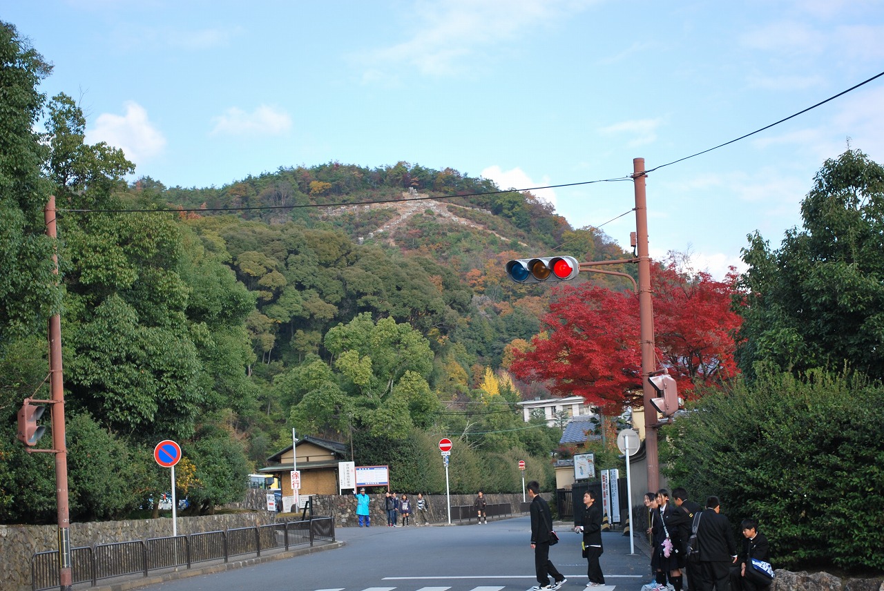 金閣寺正門前の交差点から大文字が見えたので写真に撮りました。大文字山」は,如意ヶ岳,如意ヶ嶽とも呼ばれています。毎年8月16日にもっとも雄大な「大」の字が点火されるので有名です。標高は466mで、登山コースもあり、多くの登山客が訪れるようです。