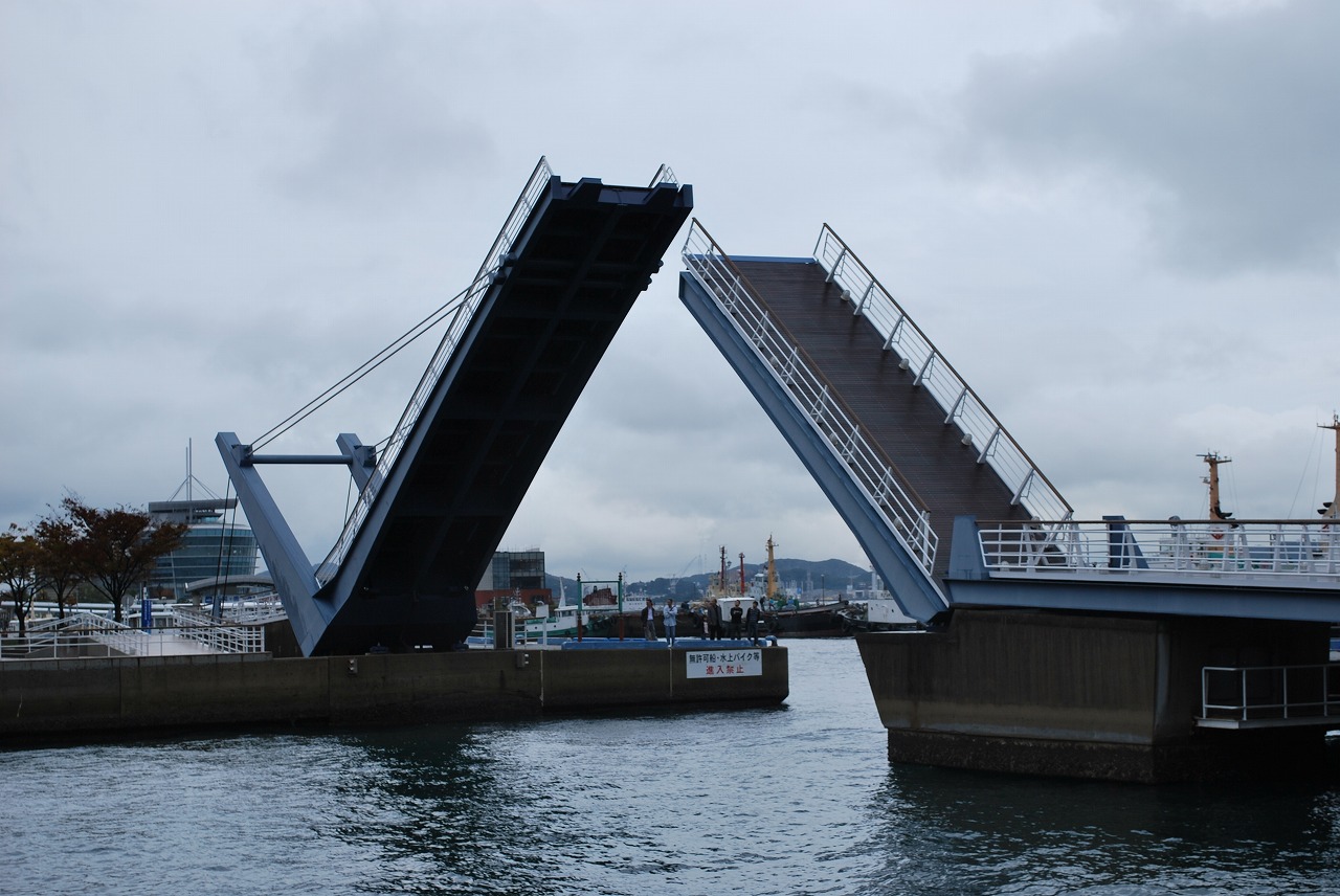 門司港駅から歩いて数分のところに、船が通る際に橋が上がるのを見たので写真を撮りました。船が通る際に係の人が通行人に注意を促し、橋の出入り口をふさいで橋をあげていました。全部あがるのに約10分くらいかかってました。大がかりな橋でしたね。あんまり最近見かけないと思います。船はあまり大きなものではなく小さな観光船でした。
