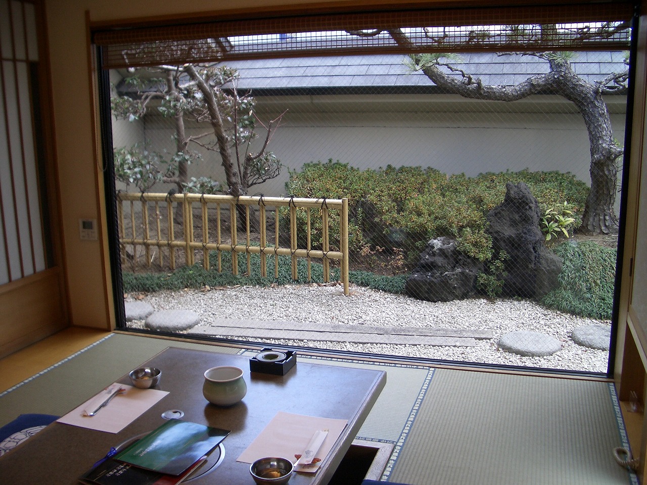 とある かに料理専門店での特選かに懐石の写真です。まず、事前に予約したので個室が用意されていました。質素な和室で、外には少しばかりですが庭があります。掘りごたつ式になっていて、足元は床暖房がきいていて非常に温かかったです。