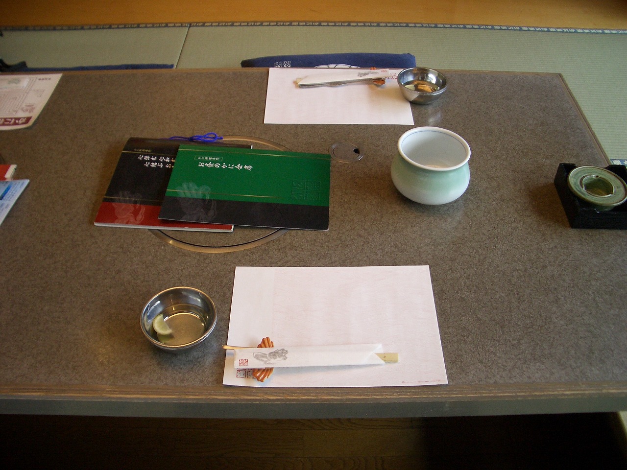 とある カニ料理専門店での個室のテーブルの写真です。料理を頼む前に綺麗な状態のテーブルの雰囲気を写真に撮ってみました。テーブルの下は、掘りごたつになっていて、足元にはあたたかい暖房がしてありました。当日は非常に寒かったので、助かりました。けっこうテーブルも広く、たくさんの料理が来ても大丈夫でした。