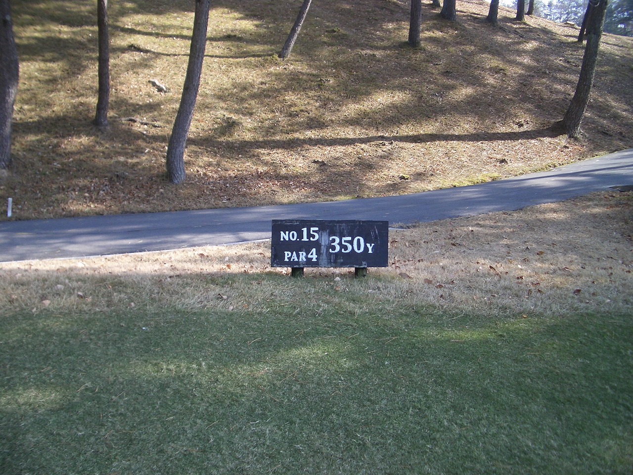 滋賀カントリークラブ15番の写真です。このホールは375ヤードPAR4のミドルホールです。セカンド地点が右に傾斜しているので左めを狙っていく。グリーン右サイドは右に傾斜しているのでグリーンセンターを狙っていくと安全である。バンカーが回りに3つあるので注意が必要。