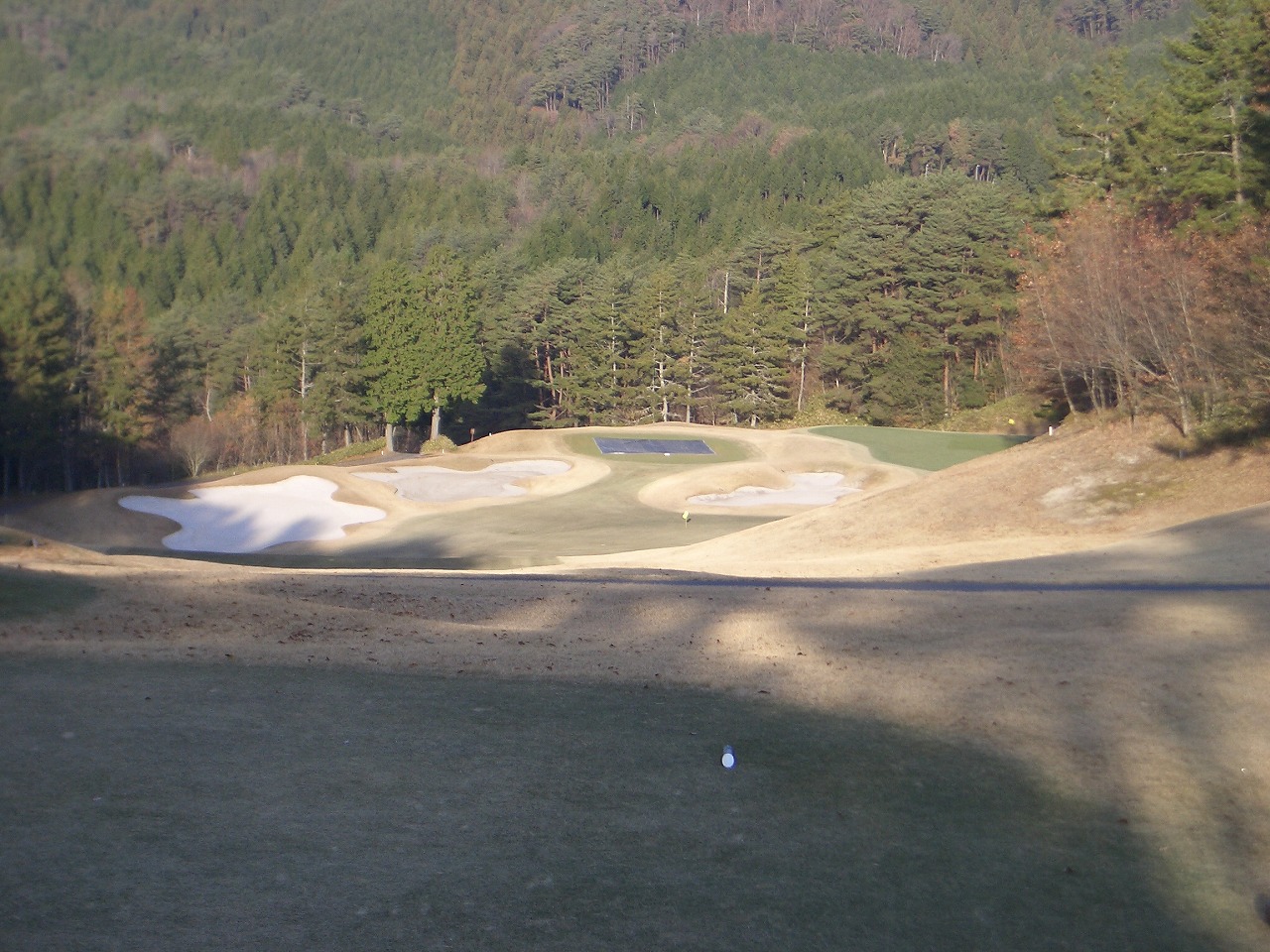 滋賀カントリークラブの2番の写真です。このホールは329ヤードPAR4で距離はさほどながくありません。少し右にまがっていて、かなりのうちおろしです。左に流れるので、右めを狙っていきます。グリーン奥は狭いので、確実にグリーンセンターを狙ってセカンドショットを打つとPARも取れるでしょう。
