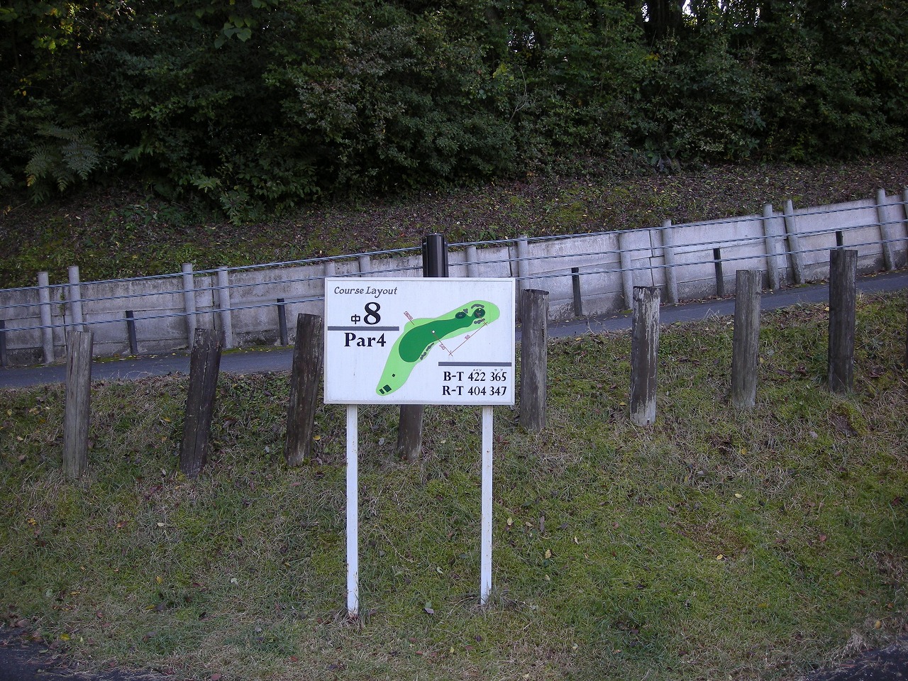 グリーンハイランドCC 中コース 8番のティーグランドからの写真です。このホールは404ヤード PAR4の眺めのホールで中コースでは一番ハンディキャップが高いホールです。右ドックレッグですが、ティーグランドからはかなり広いので思い切って狙っていけます。ナイスショットしてもセカンドはかなり距離が残るので、3オンでもいいと思っていきましょう