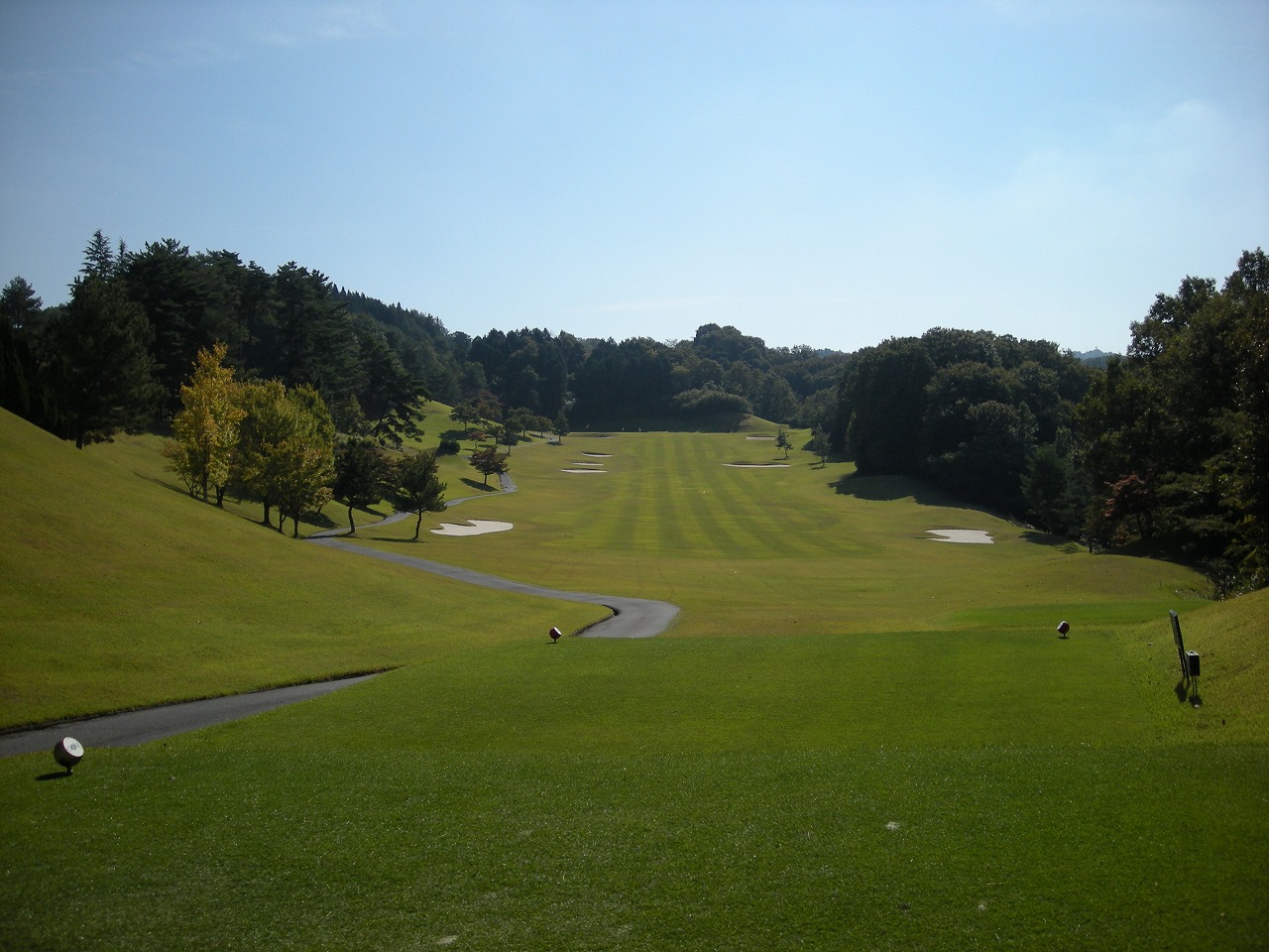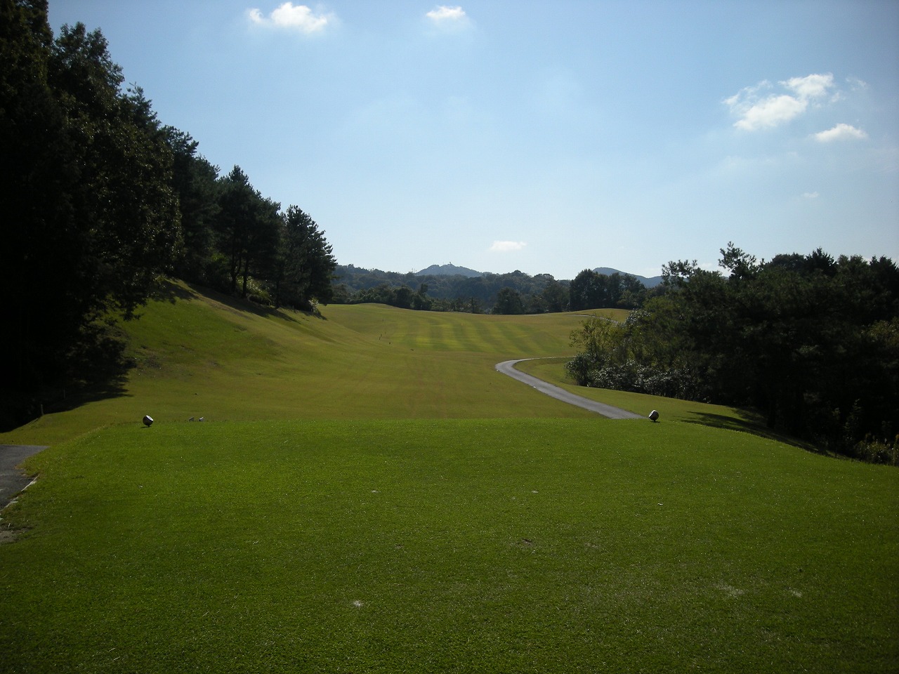 グリーンハイランドCC 中コース 1番のティーグランドからの写真です。このホールは426ヤード PAR4です。ティーグランドからは広いし距離はそこそこあるので思いっきりせめて行きましょう。少し左に行っても斜面から落ちてくるので大胆に。。。