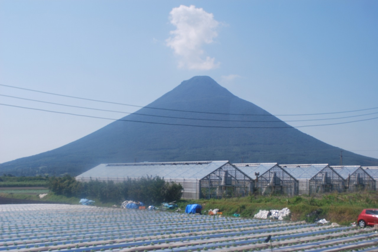指宿枕崎線の列車から見えた開聞岳の写真です。雲ひとつない天気でしたが山頂付近から上に向かって雲が上がっているように見え、まるで山頂が噴火しているように見えました。なかなか珍しいのではないでしょうかね。いつみても形の綺麗な山で、感動しますね。