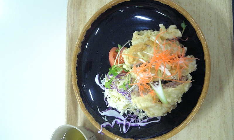 社員食堂での昼食の写真です。今日は、豚肉のから揚げ南蛮マヨソースかけです。ロース豚肉1枚をから揚げし、南蛮風のマヨネーズソースがかかっていました。野菜はキャベツ、人参の千切り、トマト1切れ、かいわれ大根、むらさきキャベツ少々です。まだ温かくておいしかったです。価格は367円です。