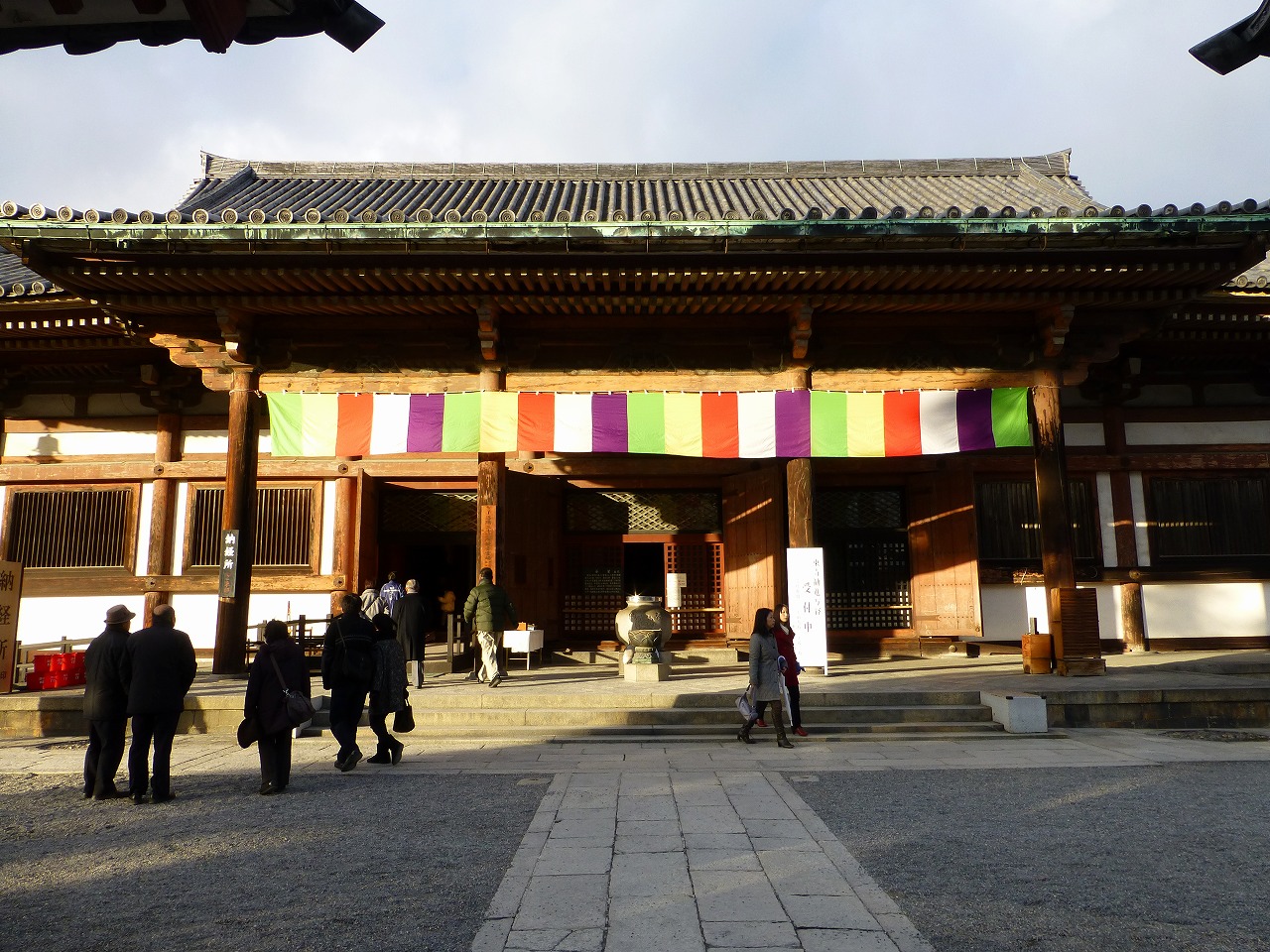 京都の東寺の特別拝観の様子の写真です。お正月ということで、五重塔と金堂、講堂の中を見学できる特別拝観です。入ってみようかなと思いましたが、時間がちょうど16時で閉門まで30分しかないないし、拝観料が800円と高いこともあり、やめて外から見学しました。(柵の外からでも中は見えませんが外観だけでも見れましたよ)