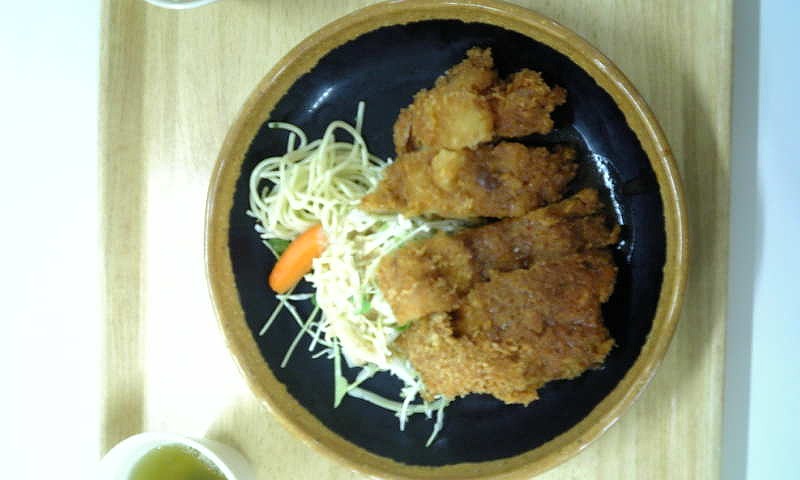 写真食堂の昼食の写真です。今日はチキンカツです。大きなチキンカツに、デミグラスソース(たぶん)がかかっています。ゆでた人参、少量のスパゲティ、キャベツが入っています。結構大きなかつでボリューム満点ですね。できたてのようで、すこしあたたかかったです。味もそこそこおいしかったです。価格は367円です。