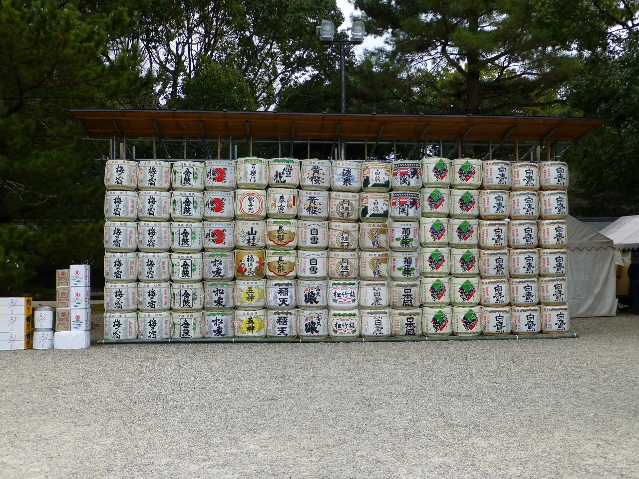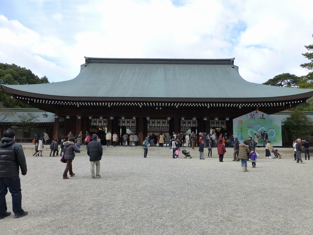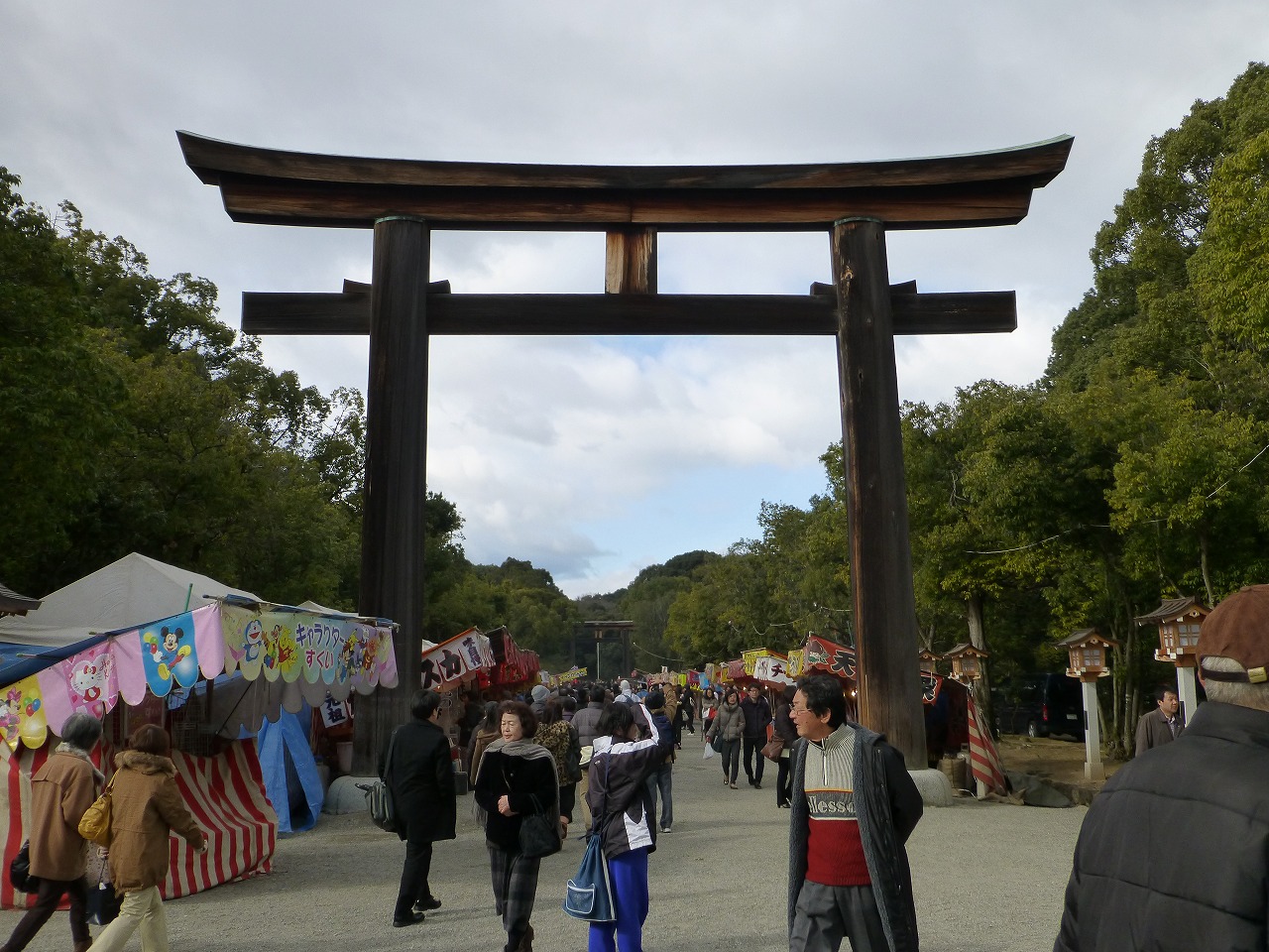 橿原神宮の写真です。橿原神宮は、神武天皇が畝傍山の東南・橿原の地に宮を建てられ即位の礼を行われた宮址に、明治23年に創建された。本殿は神宮創建に際し、移築されたもの。素木建、入母屋造、屋根は桧皮葺の建物でもっとも重要な御殿です。