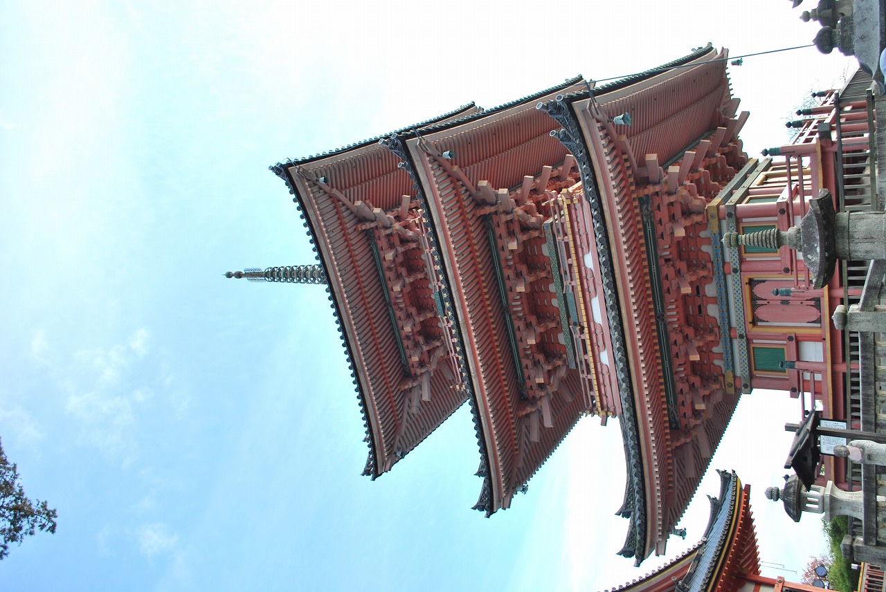 京都の清水寺の3重塔の写真です。この3重塔は、平安時代初期847年に創建され、1632年に再建。現在の塔は1987年に解体修理したものです。総丹塗りとともに、桃山様式を示す極彩色文様を復元したものです。三重塔としては日本最大級の高さ約31メートルの塔です。
