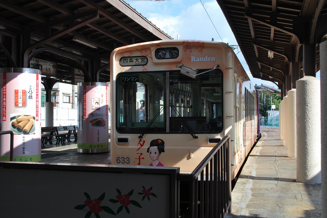 嵐電嵐山駅に停車中の電車の写真です。嵐電は、京福電鉄が経営していて、嵐山から四条大宮や北野白梅町を結ぶ小さな路線で、路面電車のようです。秋の紅葉シーズンにはたくさんの観光客の足として市バスとともに活躍しています。お得な切符で1日乗り放題切符が500円で販売されており、たくさんの観光施設の優待券が付いています。電車は渋滞がなく、移動には便利ですよね。
