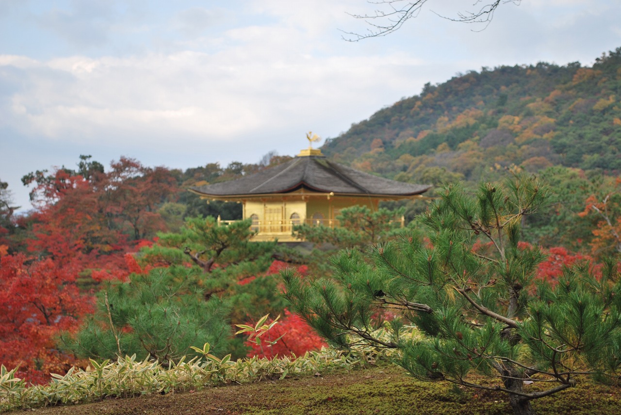 金閣寺の正面からの写真はパンフレットなどでよく見ると思いますが、参道を歩いて登って行くと、紅葉とともにすこし裏からの金閣寺が見えたので写真に撮ってみました。結構遠かったのですが、綺麗に撮れました。このような写真は、実際に行って入ってみないと撮れないものでしたので珍しいと思います。