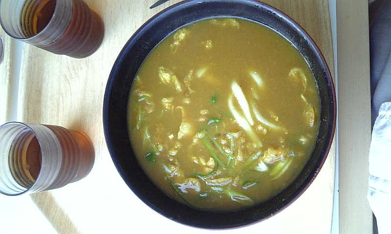 社員食堂の昼食の写真です。今日は、カレーうどんです。具は鶏肉、白ネギ、油揚げくらいですが、汁が非常においしく、毎週食べています。食堂の社員の人と仲良くなって、いつも黙ってても出てきて大盛りにしてくれます。値段も262円と安く、懐にも優しいですね。