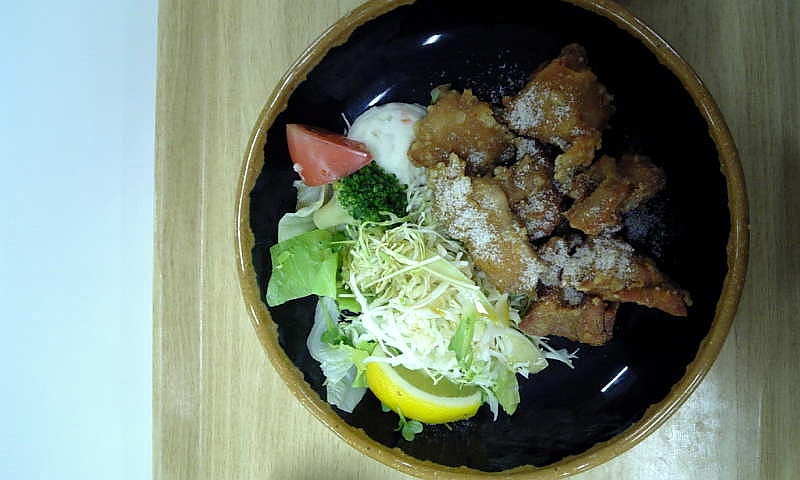 昨日の社員食堂での昼食の写真です。これは、鶏のから揚げで他にキャベツの千切り、レタス、ポテトサラダ、ブロッコリー、トマトが入っています。塩をかけて、レモンを絞って食べました。おいしいですよ。家でも結構食べますがまた一味違う味がしてどちらもおいしいですね。揚げたてを出してくれるのであったかくていいですね。値段は367円とお得です。