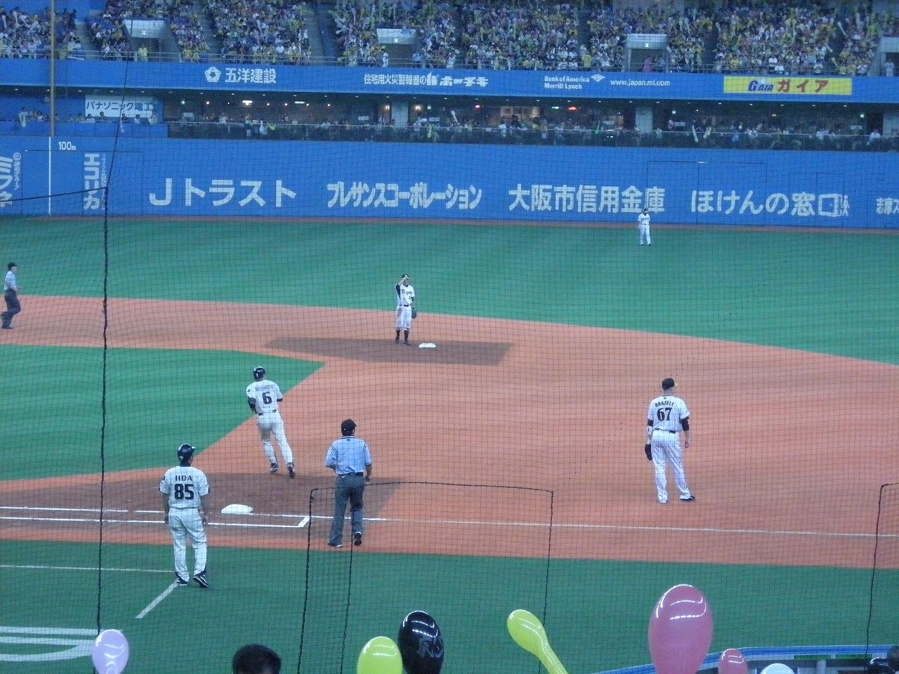 これは、阪神対ヤクルトの試合中風景です。なかなかいい席が取れなかったのですが今回、内野のいい席が取れましたので写真を撮ってきました。こんなに近くで選手を見ることがなかったので、非常に興奮しました。ベンチに戻ってくるときに、練習ボールをスタンドに投げ入れたりしますが、もう少しで取れたのに 残念でした。