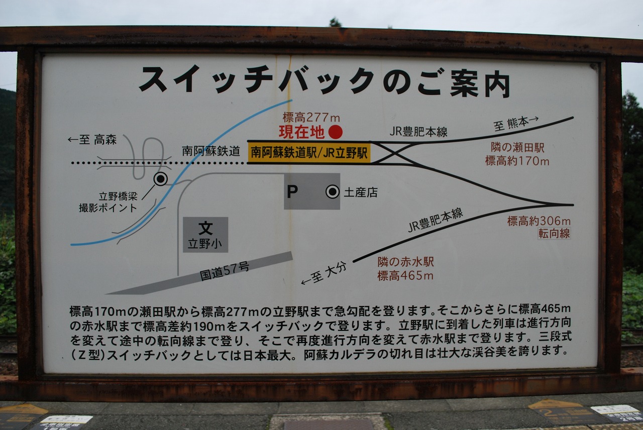 デジカメでスイッチバックの案内図を撮影しました。JR九州の豊肥本線の山の中です。珍しいので・・スイッチバックとは急坂を列車が上る際に、坂だけでは無理なので一旦折り返して段々に上って行く仕組みのことです。運転手が前方に後方に2回移動するので結構大変で時間がかかります。これも昔の列車のパワーが少なかったので知恵を働かせて作ったものでしょう。工事も大変だったでしょうね